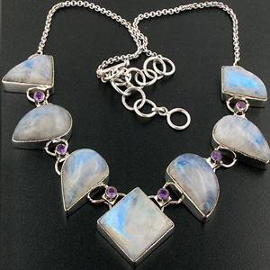 Fine Quality Sterling Silver Necklace Studded with Cabochon Rainbow Moonstone.