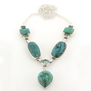 Fine Quality Sterling Silver Necklace Studded with Turquoise and Blue Topaz Stones.