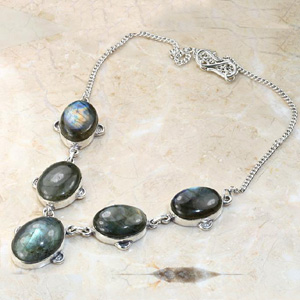 Fine Quality Sterling Silver Necklace Studded with Labradorite Cabochon Stones.