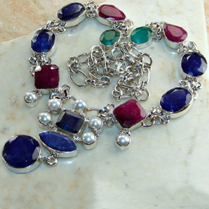 Fine Quality Sterling Silver Necklace Studded with Dyed Ruby, Sapphire, Emereld and Pearl.