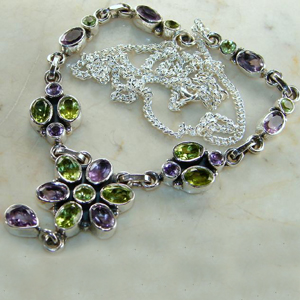 Fine Quality Sterling Silver Necklace Studded with Amethyst and Peridot Faceted Stones.