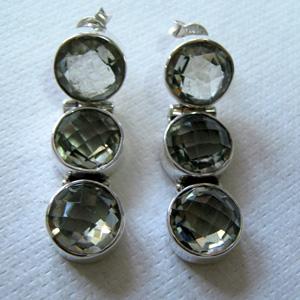 Fine Quality Sterling Earring Pair Studded with Green Amethyst Faceted Round Stones.